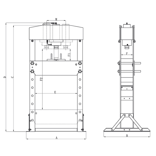 | Ширина (А) | Глубина (B) | Высота рамы(С) | Общая высота(D) | Горизонтальное смещение цилиндра(M) | Ход станины (F1-F2) | Ширина рабочего стола(Е) |