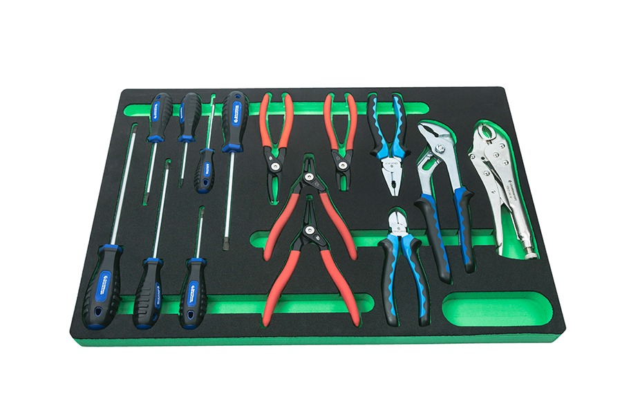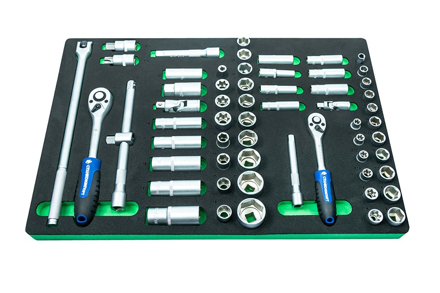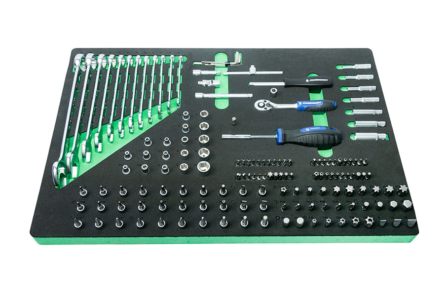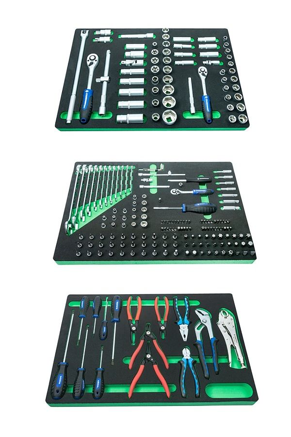 Данный комплект можно назвать как стартовый так как включает в себя ручной инструмент с посадочным квадратом 1/4, 3/8 и 1/2 дюйма, большое количество и разновидности бит, отвертки, губцевый инструмент и съемники стопорных колец, что вполне достаточно для выполнения довольно широкого спектра проводимых работ.