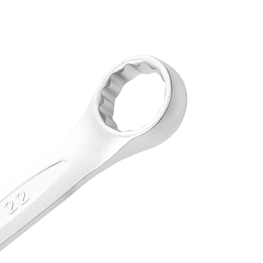 Финишная обработка Soft matt и хром никелевое покрытие комбинированного ключа обеспечивает надежную защиту от коррозии, а также надежный хват и препятствует выскальзыванию инструмента из рук. 12-гранный профиль накидной части подходит к головкам болтов и гайкам как 6-, так и 12-гранного профиля, и обеспечивает 5 градусный шаг перехвата. Специальный отгиб, в 15 градусов накидной части ключа позволит работать в местах с ограниченным доступом к крепежу и поможет подобраться к крепежу как с торца, так и с боку, в зависимости от места выполняемых работ.